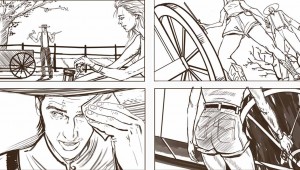 The shaded line drawings enclosed below delivers a strong identity to the narrative of the storyboard, emphasizing the mood of the script and conveying expressiveness to the character’s personality.
